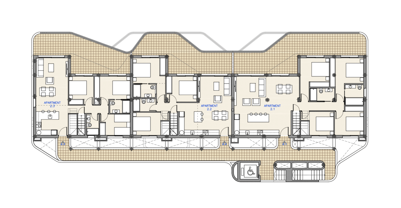 - 3 penthouses met 3 of 4 slaapkamers, grote terrassen, panoramisch uitzicht en een privé solarium.