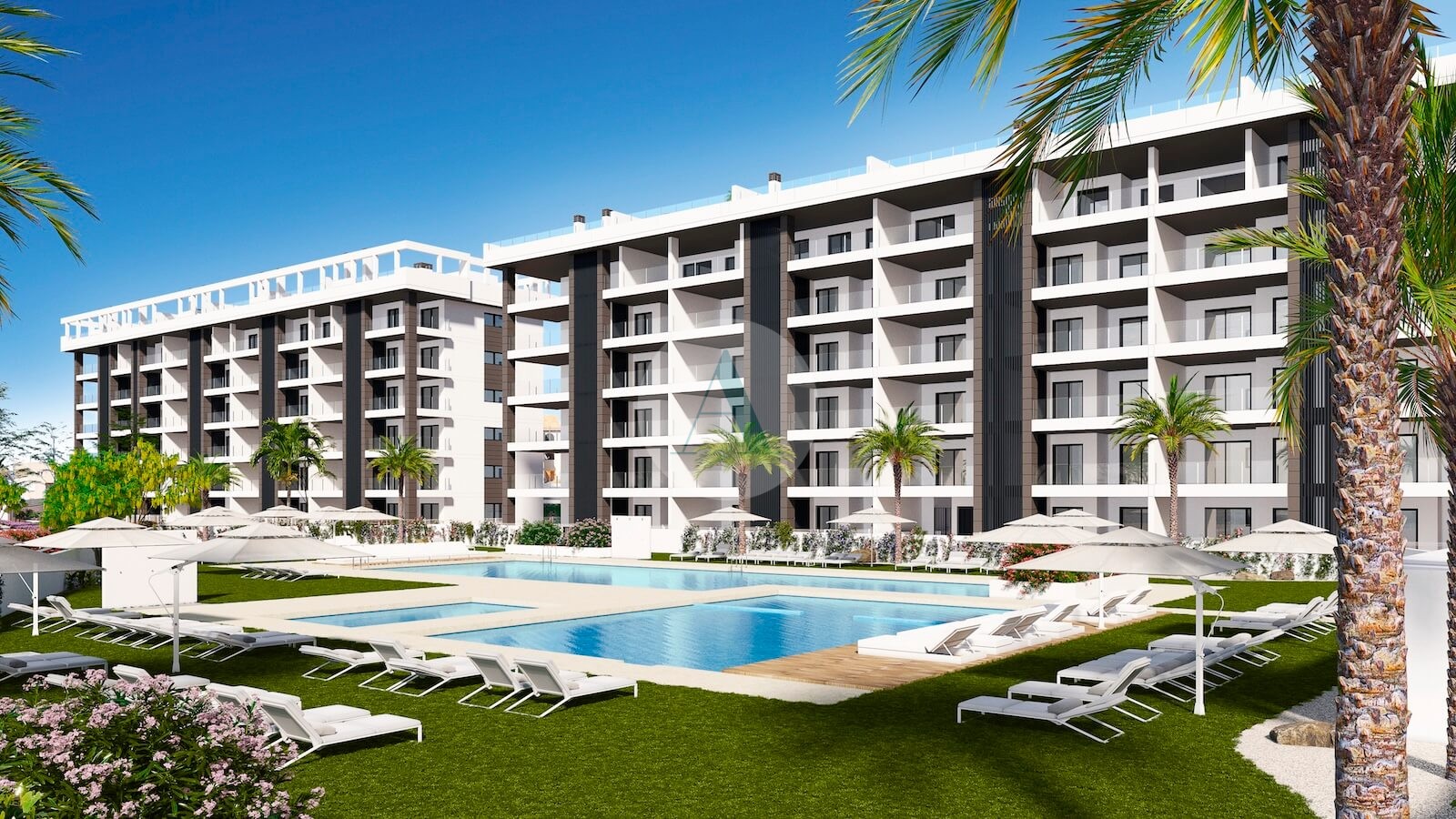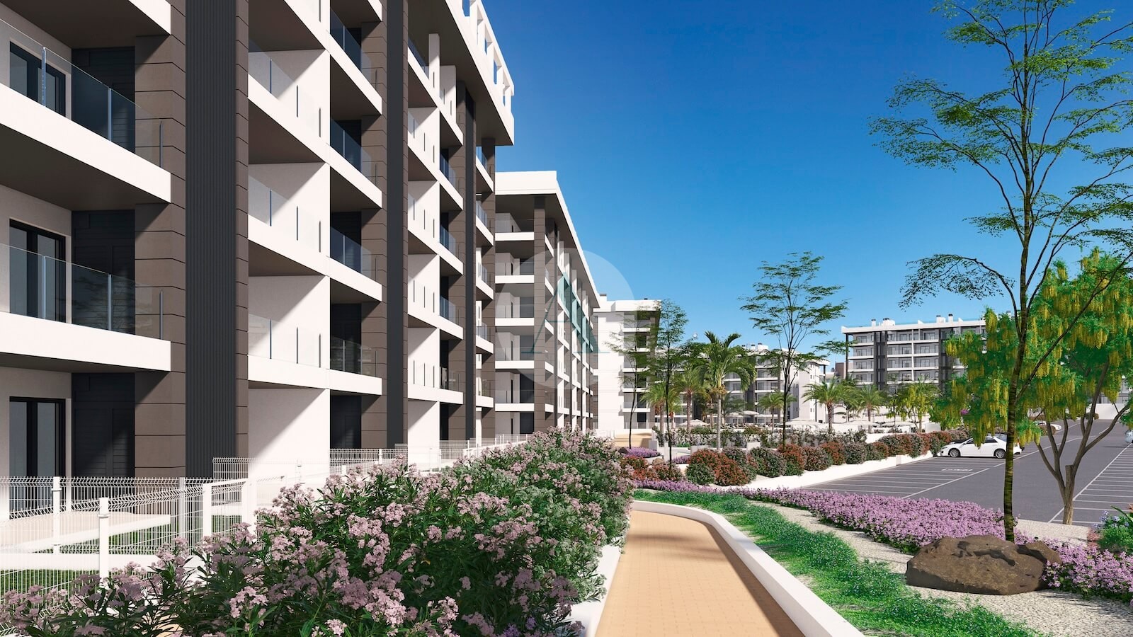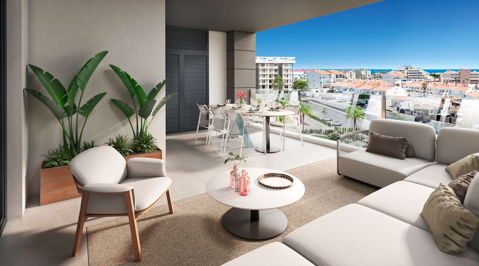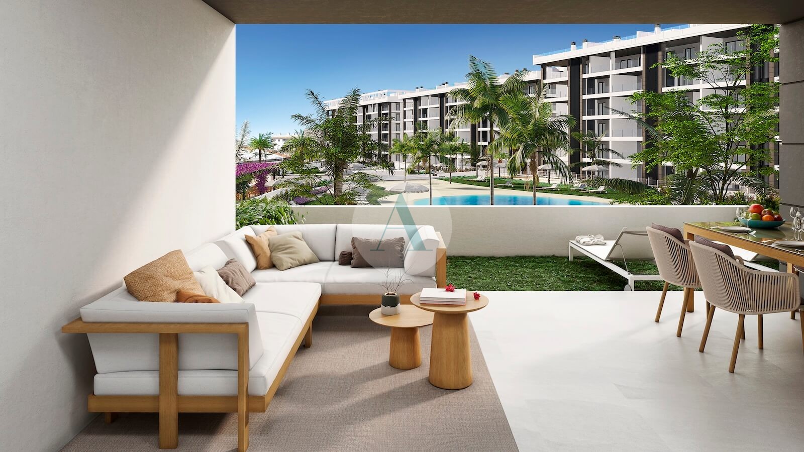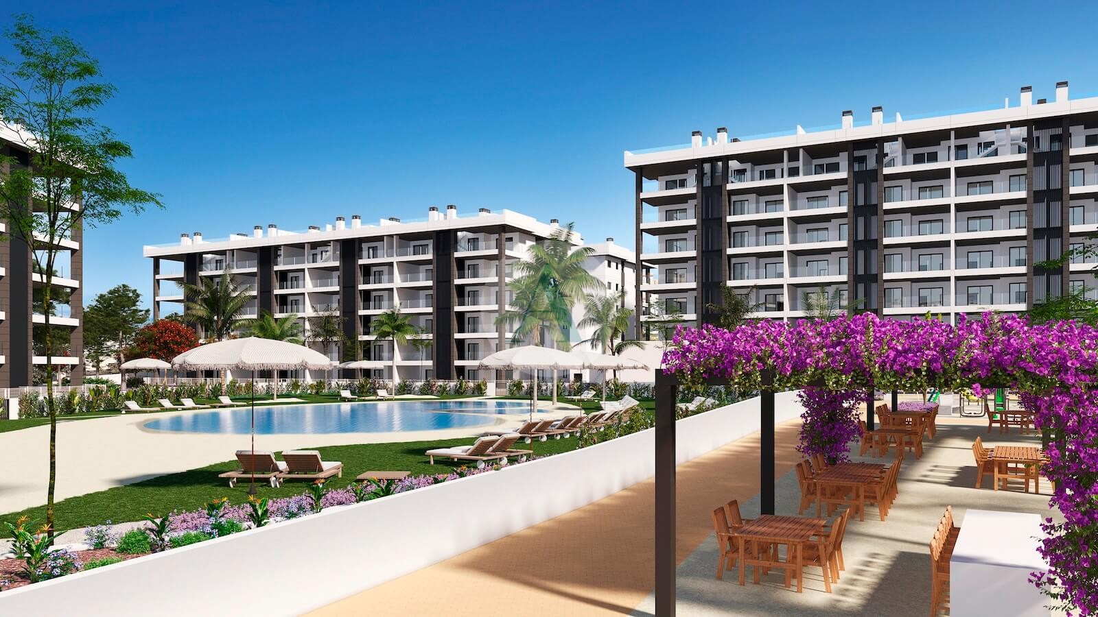 Elke woning heeft een groot terras aan de voorkant, waarvan vele met uitzicht op zee (vanaf 2de verdieping), een zuidoostelijke oriëntatie en uitzicht op de tuin en de zwembaden.